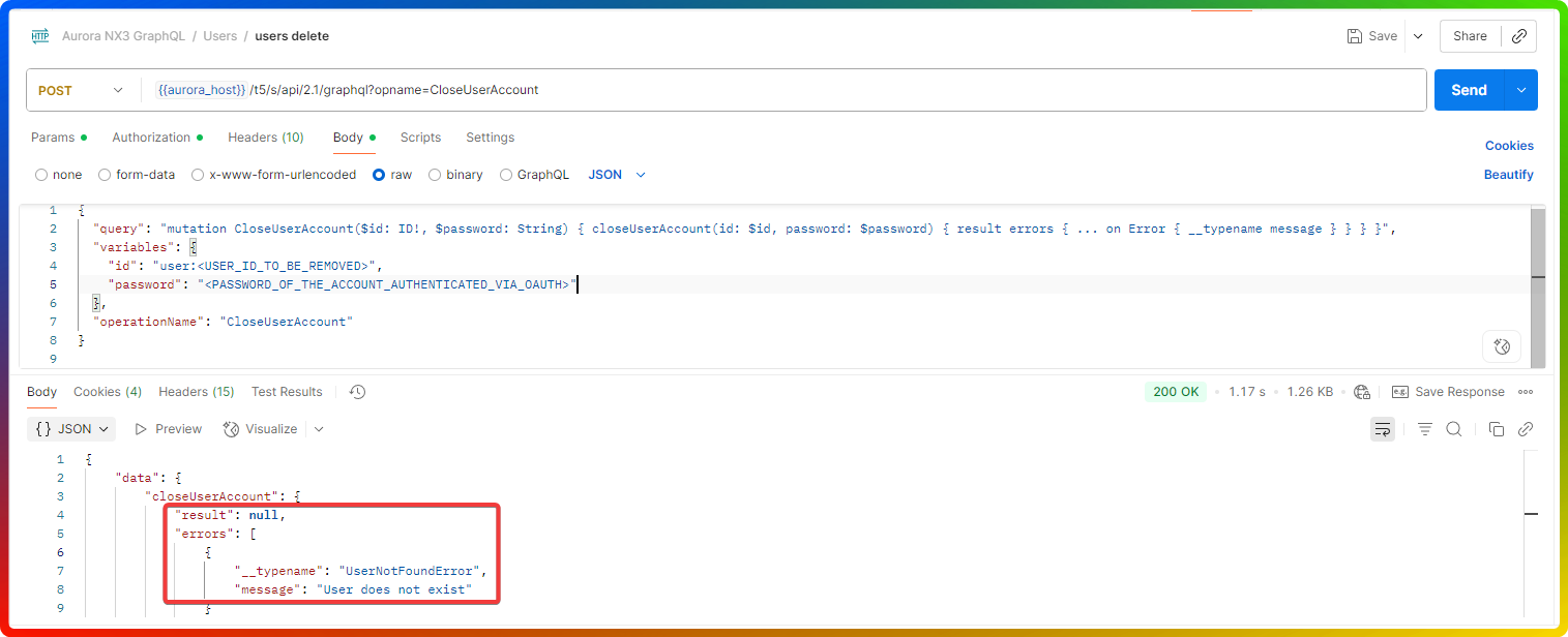 - Execute the CloseUserAccount mutation and check the result. A successful operation will return true; otherwise, check for errors in the response.