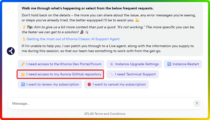 If you need access to one or more Aurora GitHub repositories managed by Khoros, you can submit your request directly via the AI Assistant in the support interface. This initiates an automated ticketing workflow—no manual steps required on your end beyond submitting the necessary details.