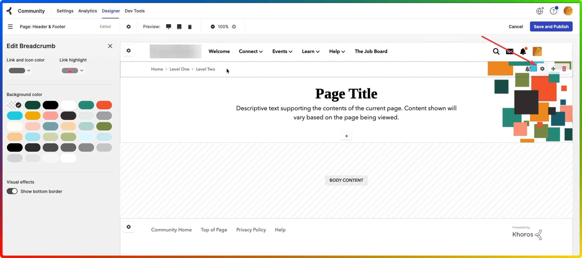 - Add the breadcrumbs component back to the common header via: Add Widget > Common > Breadcrumb: